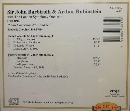 Sir John Barbirolli, Arthur Rubinstein, London Symphony Orchestra, Frédéric Chopin - Piano Concertos No. 1 and No. 2 [CD CD] (NM or M-)