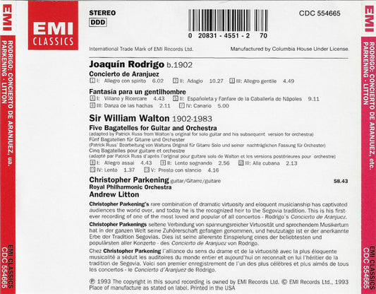 Joaquín Rodrigo, Sir William Walton, Christopher Parkening, Royal Philharmonic Orchestra · Andrew Litton - Concierto De Aranjuez / Fantasia Para Un Gentilhombre / Five Bagatelles For Guitar And Orchestra (CD) (VG+)