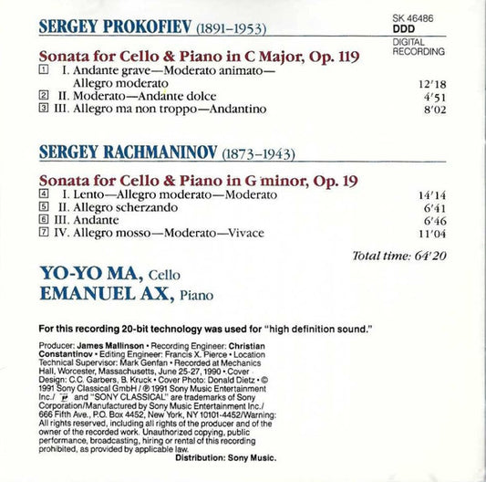 Sergei Vasilyevich Rachmaninoff • Sergei Prokofiev - Emanuel Ax • Yo-Yo Ma - Cello Sonatas (CD) (VG+)