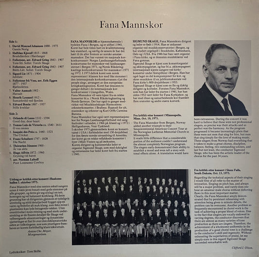 Fana Mannskor , Dirigent: Sigmund Skage , Organist Ivar Rutledal , Solist Ingunn Skage - Julemusikk (LP) (VG+)